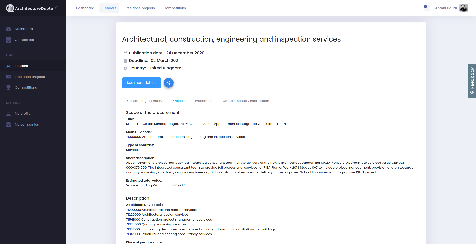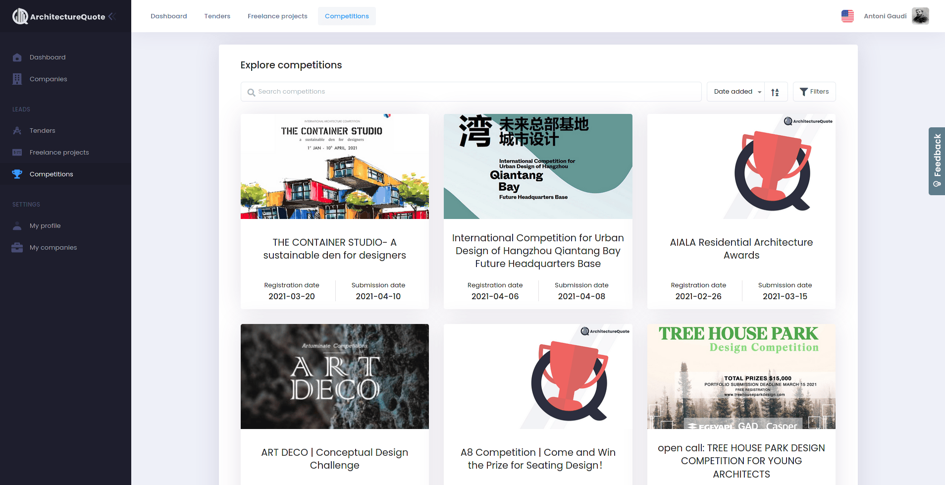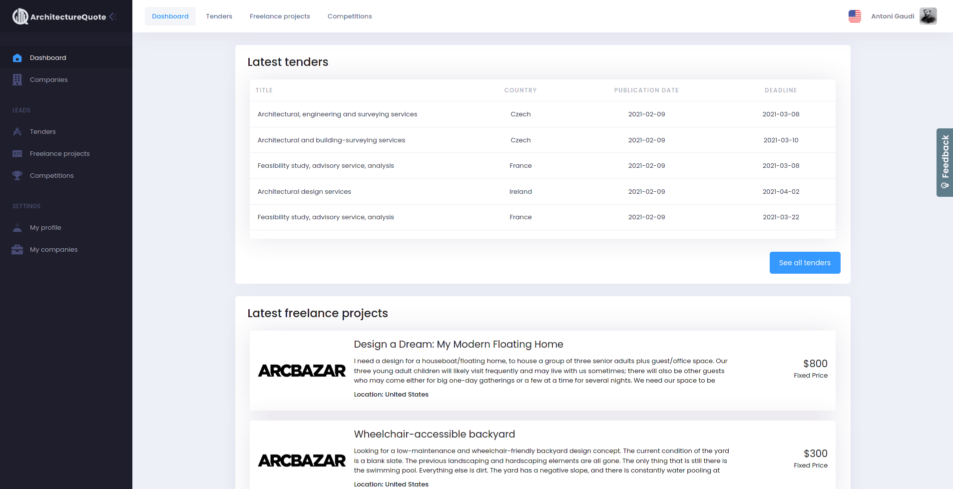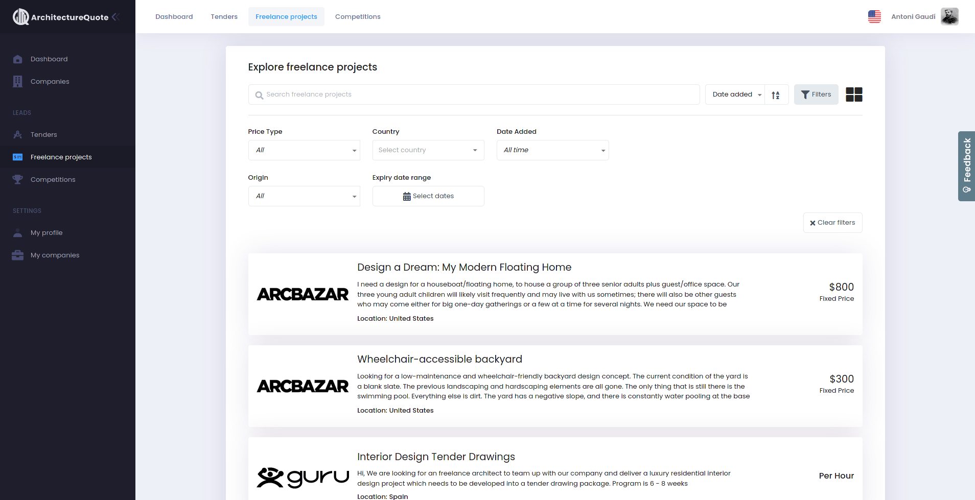 ArchitectureQuote's platform aims to help architects with finding projects by gathering leads from many different sources that are publicly available. The leads are categorized based on their type. The different types of projects that are listed on the platform include tenders (which are projects issued by governments), competitions, freelance projects (from sites like Guru, Upwork, and PeoplePerHour), and finally organic leads coming from the ArchitectureQuote's website.
