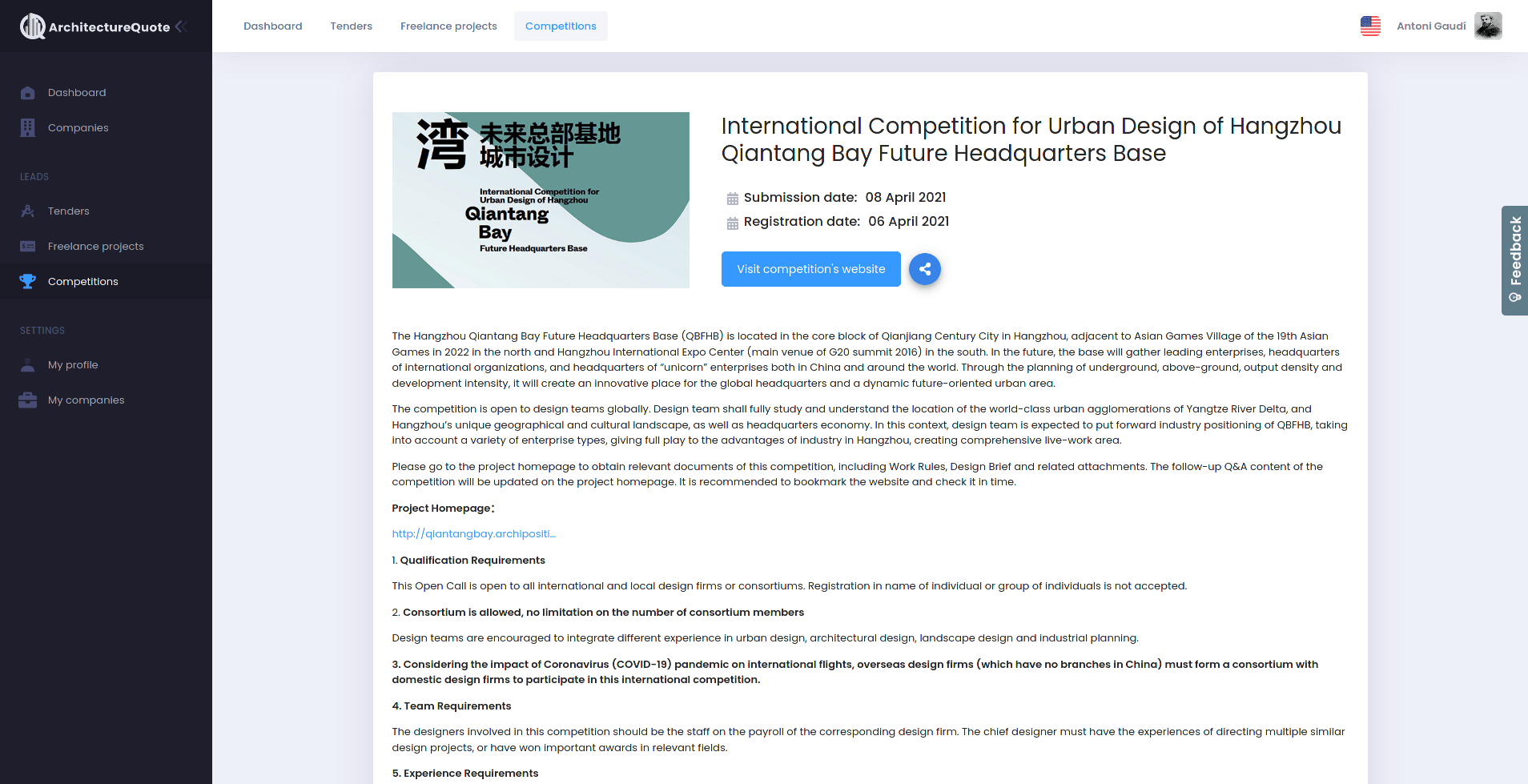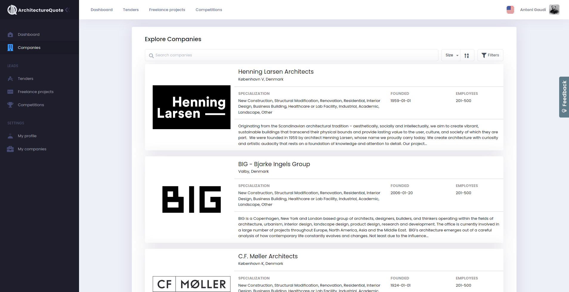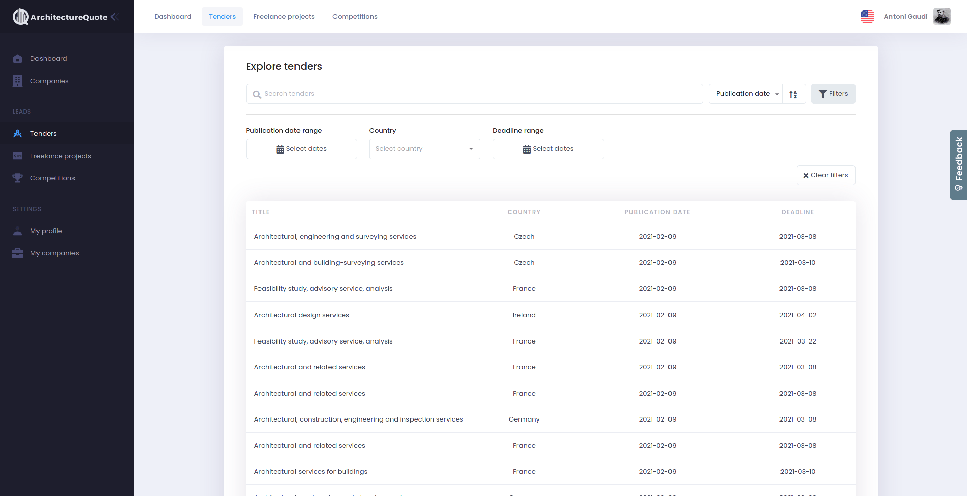 A program that automatically gathers tenders, freelance projects, and competitions from across 14 different websites where the data is publicly available. Later, they are displayed to architects on ArchitectureQuote’s platform.