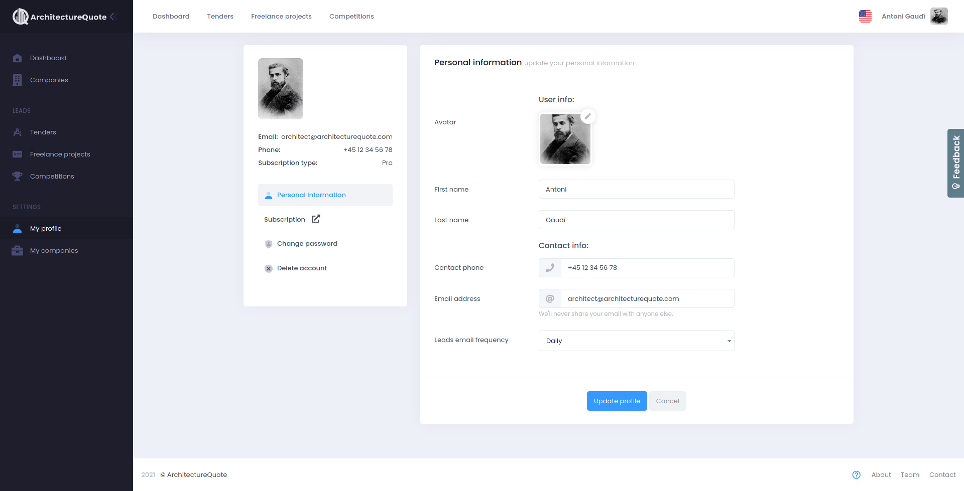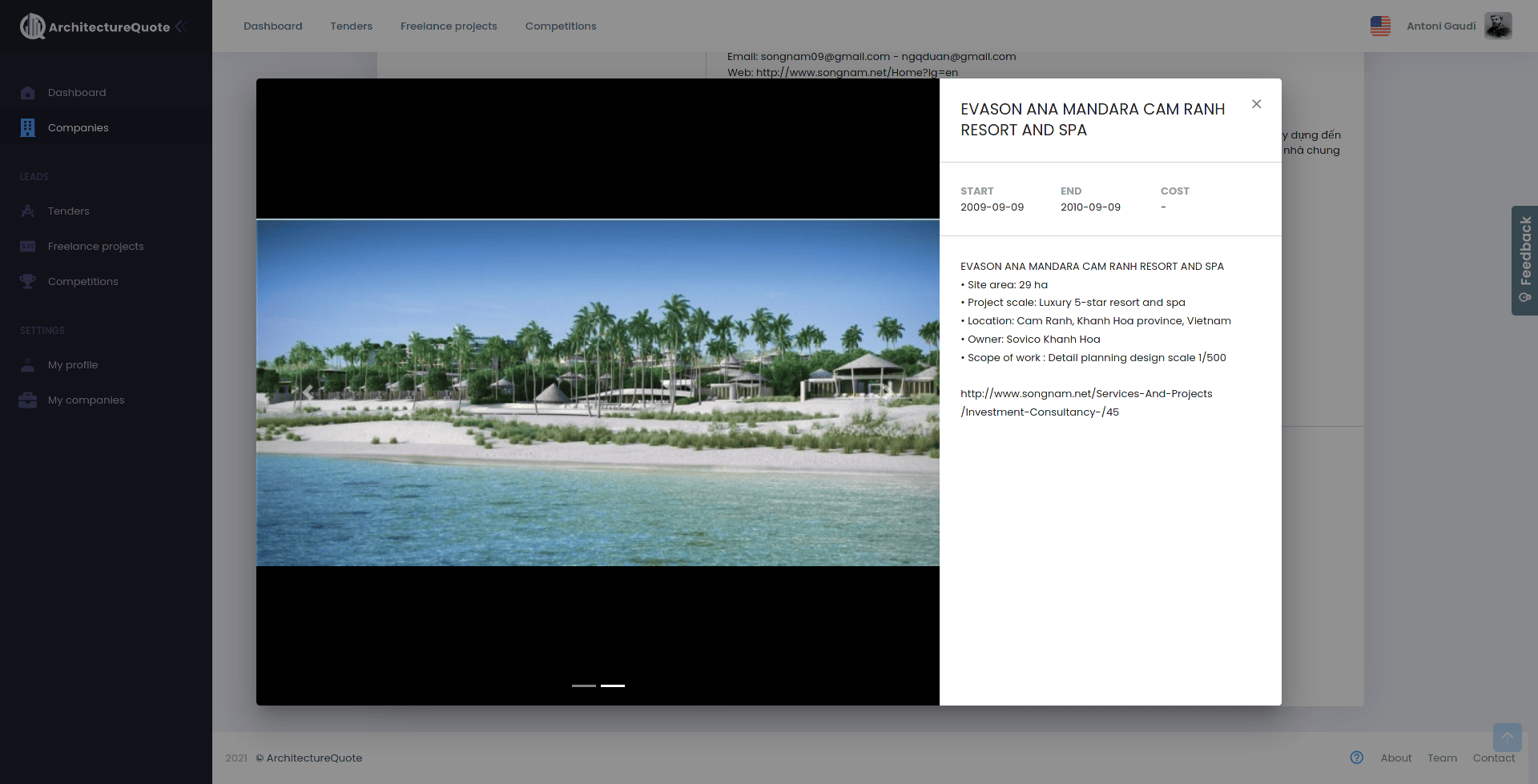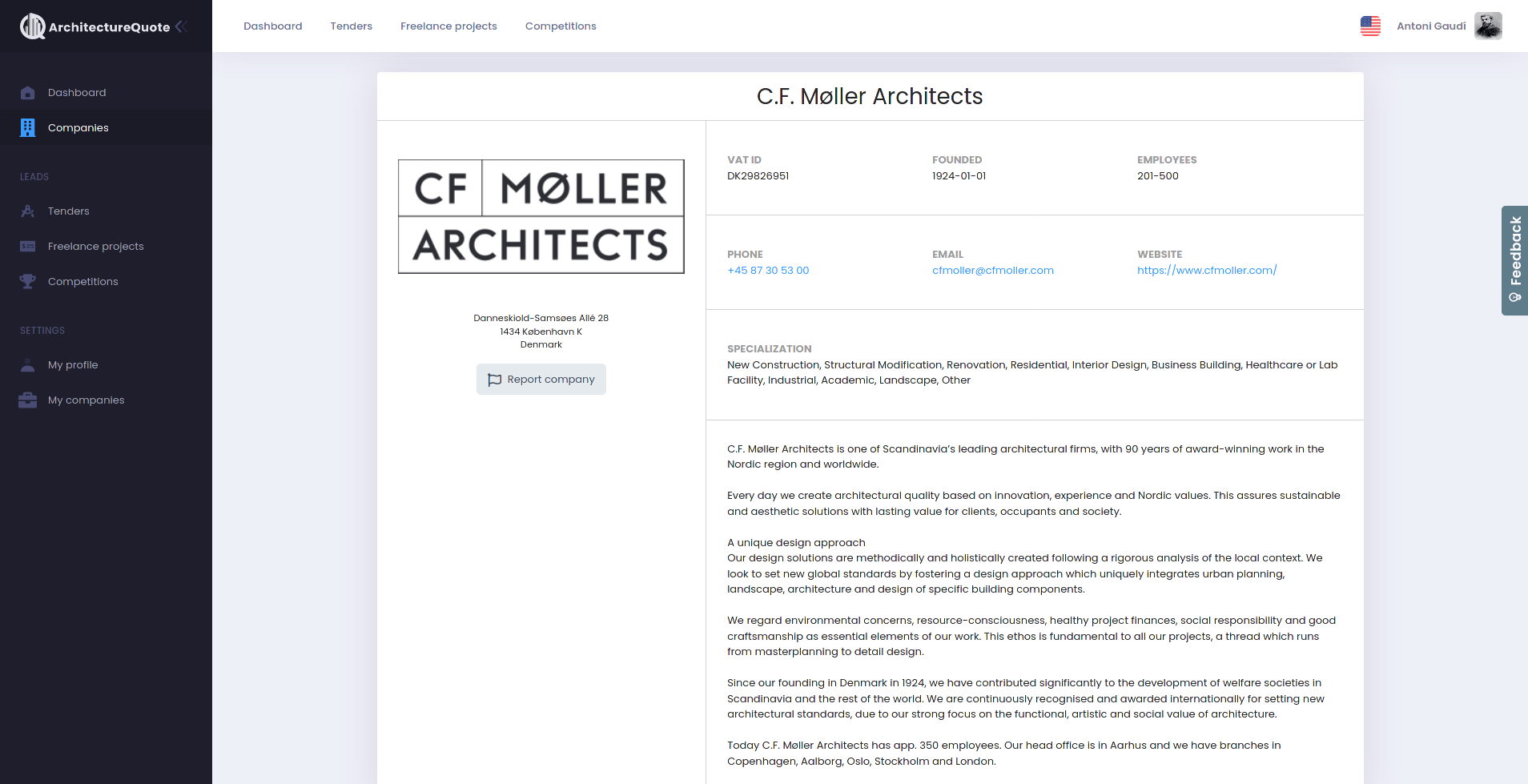 The ArchitectureQuote website is a place where visitors can read about the company and its product. It also allows them to sign up for access to the platform and ask for a free cost estimate of their project. These requests are made to the back-end where they get processed and return a response. There is also a page where 20 latest scraped competitions are displayed and a catalogue of companies. The website is based on WordPress.